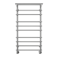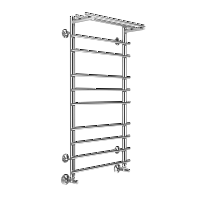 Модель "Контур с полкой" относится к линейке в стиле хай-тек, тяготеющей к лаконичным формам и хромированным поверхностям, и отличается наличием дополнительной прогреваемой полки для хранения и сушки полотенец.